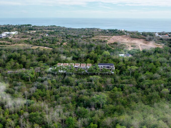 The master bedroom on the side of the pool features a luxurious four-poster bed, high vaulted ceilings, and polished wooden floors that reflect the room’s warmth. An ensuite bathroom at the back has a double vanity and a stone tub surrounded with lush foliage for a spa-like feel. A built-in wardrobe is well appointed behind the bed. Up on the second floor, two identical bedrooms have access to the balcony facing the pool with uninterrupted view of the neighborhood. Both rooms have an ensuite bath, and are equipped with a four-poster bed, built-in wardrobe and a designated work desk.